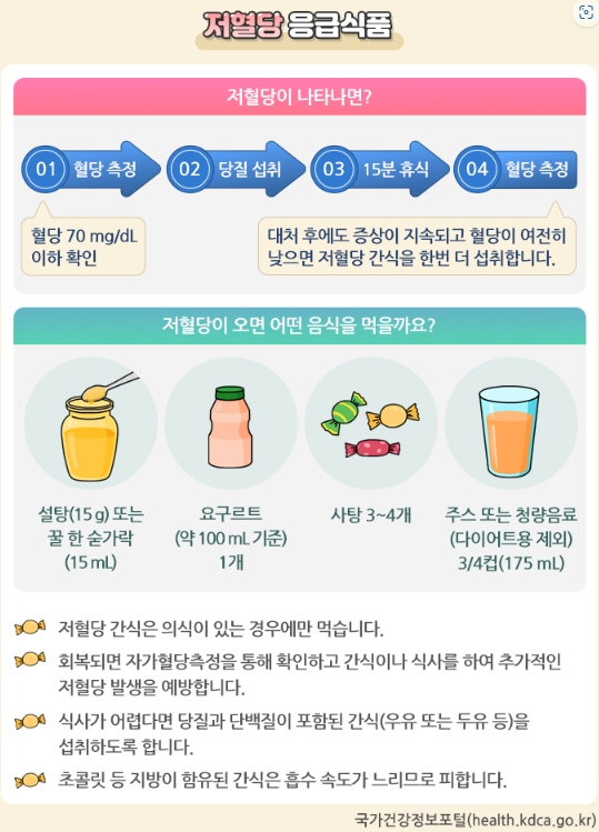 ① 혈당 수치가 70 mg/dL 미만이고 의식이 있는 경우, 포도당 15~20 g 섭취(그림 참조) 후 15분간 휴식
