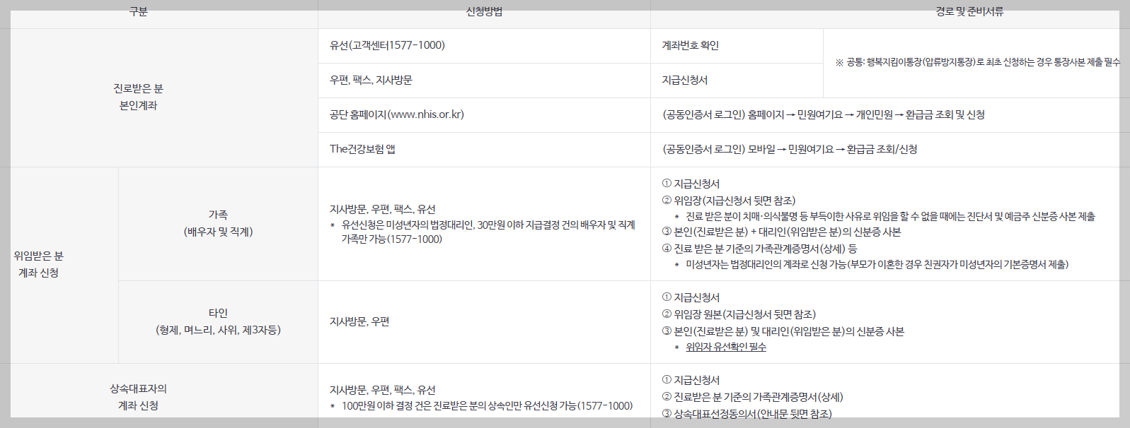 ※ 주의사항: 수진자(진료받은사람) 본인계좌로 신청하는 것이 원칙이나, 부득이한 사유로 대리인 신청시 추가 서류가 필요