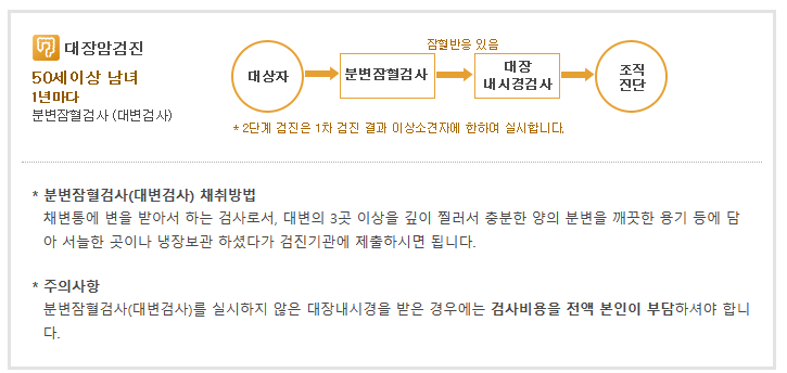 기본검사 : 분변잠혈검사(fecal occult blood test, FOBT)를 검진방법으로 합니다.
