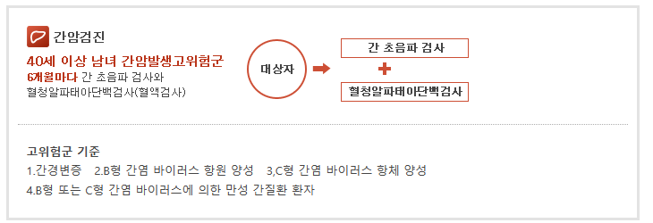 | 간 암 | 40세 이상의 남ㆍ여 中 간암 발생 고위험군* | 6개월 |