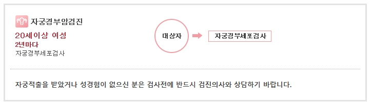 기본검사 : 자궁경부세포검사(Pap smear test)를 검진방법으로 합니다.