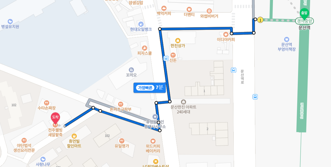 ①문산역1번 출구 → ②왼쪽 횡단보도 이용 → ③현대오일뱅크 주유소쪽으로 이동 → ④왼쪽으로 50미터 이동 → ⑤부동산끼고 우측으로 50미터 내려오셔서 →⑥ 횡단보도로 왼쪽으로 건너시면 됩니다.