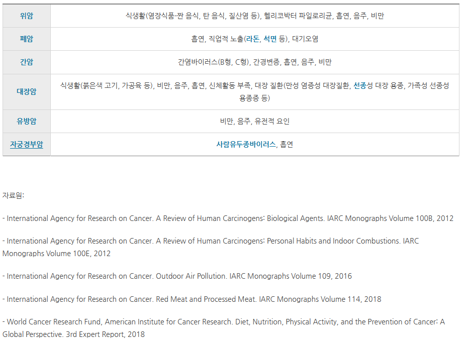 지금까지 알려진 주요 암의 원인은 아래와 같습니다.