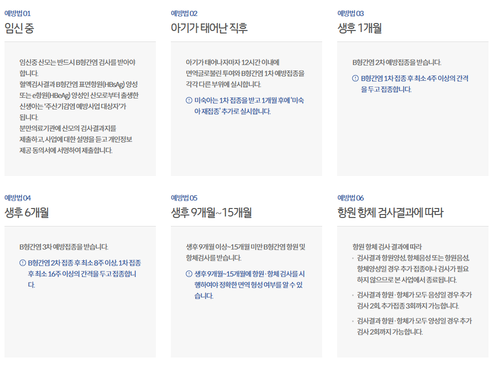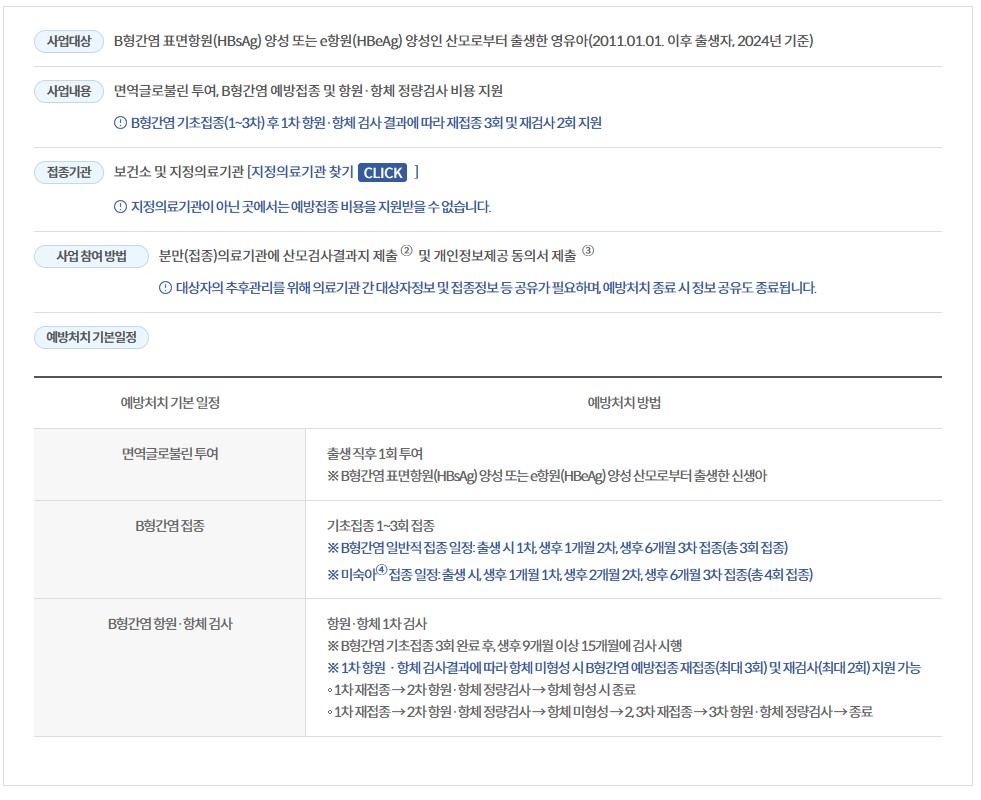 B형간염 산모로부터 출생한 신생아가 주산기 동안 B형간염에 감염되지 않도록 면역글로불린, B형간염 예방접종 및 항원·항체 검사 의료비를 전액 지원하며, 일정은 다음과 같습니다.