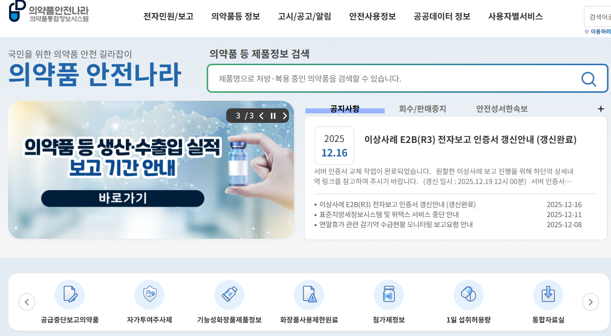 식약처 홈페이지나 의약품안전나라(nedrug.mfds.go.kr) 에서 검색해보세요.