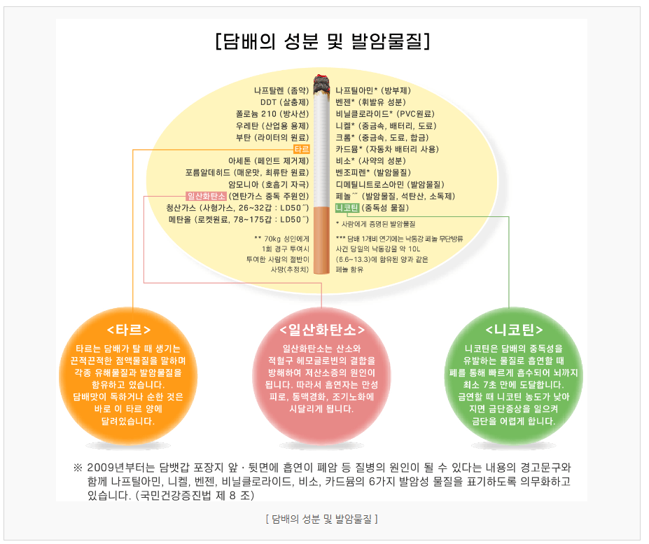 흡연은 나와 주변인들의 건강을 해치는 나쁜 습관이며, 중독성 질환입니다. 담배와 담배연기에는 중독을 일으키는 니코틴을 포함하여 70종의 발암 물질과 7,000종 이상의 화학 물질이 포함되어 있는 것으로 알려져 있습니다. 그중에는 크롬, 카드뮴과 같이 잘 알려진 제1군 발암 물질과 아세트산, 아세톤 등과 같은 독성 유해 물질이 포함되어 있습니다.