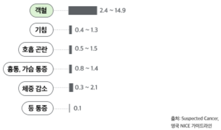 객혈이 있는 경우 폐암으로 진단될 확률은 최대 14.9%였으며, 체중 감소, 기침, 호흡 곤란 등의 증상이 있는 경우 폐암으로 진단될 확률은 2% 이하에 불과합니다.