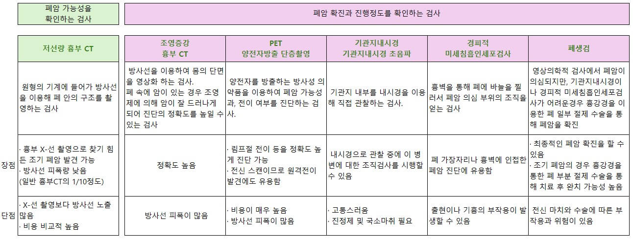 ※ 폐암 의심 증상이 있다면 필요한 검사를 받아야합니다. 암이 발견된다면 병기(질병의 진행경과에 따라 구분되는 시기)를 확인하기 위한 추가 검사가 진행됩니다.