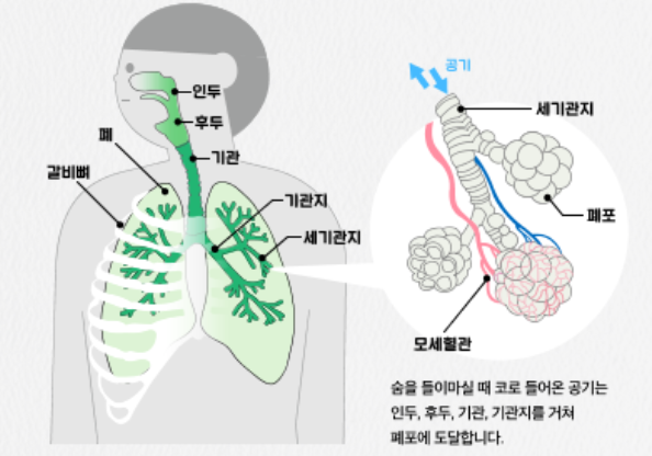 폐는 공기 중의 산소를 받아들이고, 혈액 속의 이산화탄소를 몸 밖으로 내보내는 역할을 합니다.