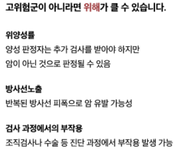 2주 이상 지속되는 기침, 쉰 목소리, 가슴 부위 통증, 체중 감소등의 증상이 있는 경우에도 의사 진료 상담을 통해 진단 검사 필요 여부를 판단받으셔야 합니다.