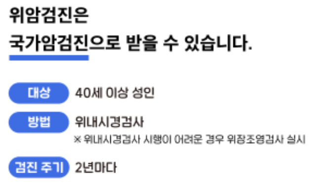 40세 이상 성인이라면 증상이 없더라도 2년마다 정기적으로 위내시경검사를 통한 위암검진을 받을 것을 권고합니다. 다만, 위내시경검사가 어려운 경우 방사선을 이용한 위장조영검사로 대체하여 위암검진을 받을 수 있습니다.