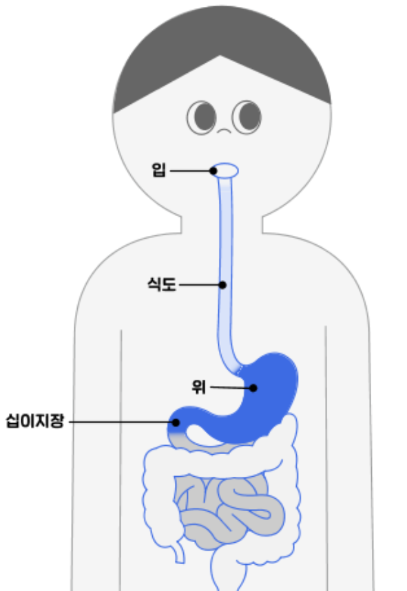 위는 위쪽으로는 식도, 아래쪽으로는 십이지장과 연결된 주머니 모양의 내장기관입니다.