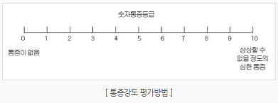 숫자통증등급(numeric rating scale)은 통증의 강도를 숫자 0~10까지 등급을 매겨서 표현할 수 있도록 하는 것입니다. “0”은 통증이 없는 것이고, “10”은 상상할 수 없을 정도의 심한 통증을 말합니다. 환자는 아래의 그림을 보고, 0에서 10까지의 숫자 중에서 현재 통증이 얼마나 심한지를 잘 나타내는 숫자에 표시하면 됩니다. 이 평가 척도를 이용하는 경우 1∼10점까지의 통증을 경도(1∼3), 중등도(4∼6), 중증(7∼10)으로 구분하며, 이것은 세계보건기구(WHO) 3단계 진통제 사용 지침에서 적절한 진통제를 선택하는 지표로 사용합니다.