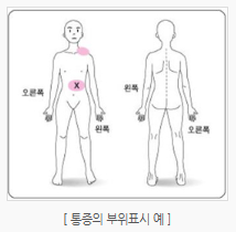 어느 부위에서 통증이 느껴지는지를 말하는 것입니다. 통증 부위가 한 곳 이상일 수 있으므로 환자가 신체의 그림에 표시하는 방법을 사용한다면 의사전달이 쉬울 수 있습니다. 아래 그림에서 통증 부위에 원이나 점으로 표시하고 그중에서 통증이 가장 심한 부위에는 x 표로 표시하면 됩니다.