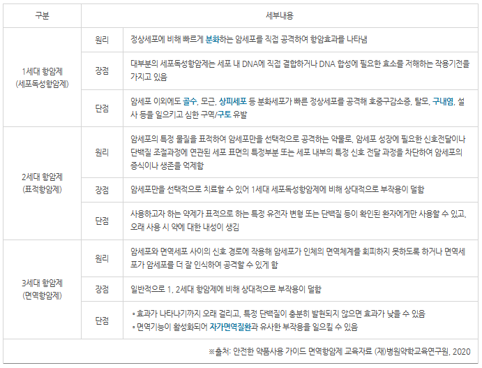 1세대, 2세대, 3세대 항암제 용법, 부작용, 주의사항