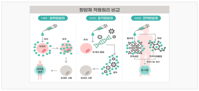 1세대 화학항암제는 암세포를 직접 공격하여 사멸시키는 방식으로 정상세포까지도 공격해 심각한 부작용을 유발하는 단점이 존재합니다. 암세포가 성장하는 원인을 억제함으로써 암을 사멸시키는 2세대 표적항암제도 정상세포 공격에 따른 부작용은 줄지만 약제 내성 등의 문제가 여전히 존재합니다. 3세대 항암치료제인 면역항암제는 인체의 면역체계를 강화하기 때문에 부작용이 적고, 효과가 광범위하며 면역체계의 기억능력을 통해 장기간 효과가 지속된다는 장점이 있습니다.