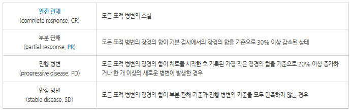 의료진은 항암화학요법을 시행하면서 항암화학요법이 얼마나 치료에 효과가 있는지, 일정한 시간 간격에 따라 평가하게 됩니다. 평가는 신체검진과 혈액검사, 엑스선영상검사(CT, MRI 등), 핵의학영상검사(PET) 등을 통해 이루어지며, 여러 가지 평가 방법이 있으나 주로 RECIST v1.1에 기반하여 평가합니다.