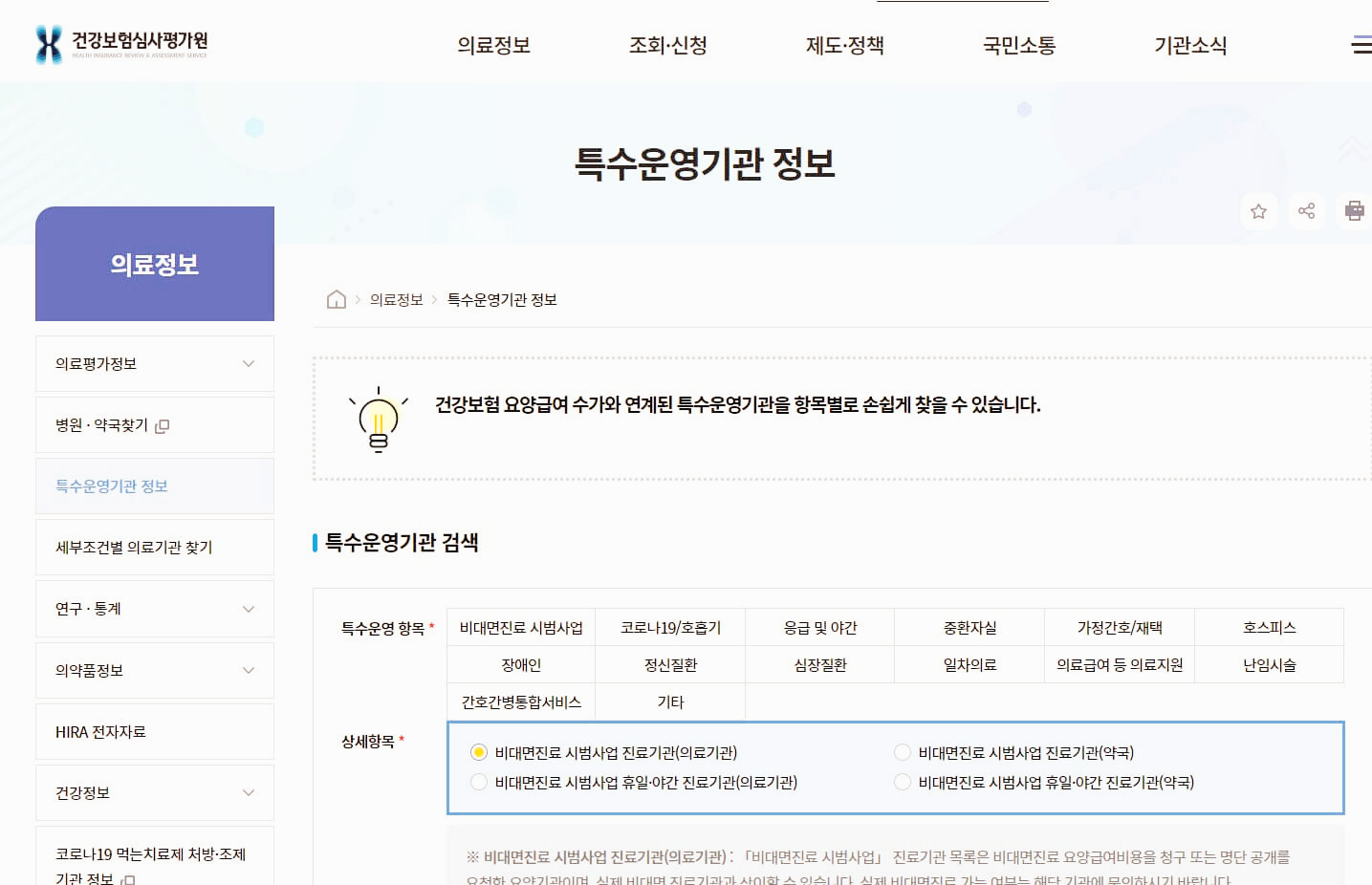 3. 상세항목 : 비대면진료 시범사업 진료기관(의료기관) 체크