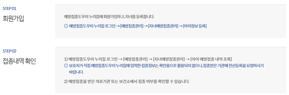 보호자는 ‘예방접종도우미 누리집’에서 자녀의 예방접종 기록을 확인한 후, 빠트린 예방접종을 완료하여 주시기 바랍니다.