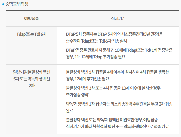 ※ [Tdap(또는 Td) 6차, 일본뇌염 불활성화 백신 5차 또는 약독화 생백신 2차, HPV 1차(여학생 대상)]