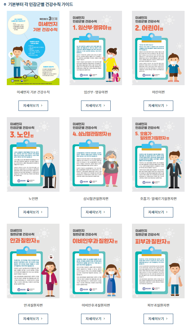 아래 내용과 같이 기본부터 각 민감군별 건강수칙 가이드에서 제공하고 있으니 살펴보세요.
