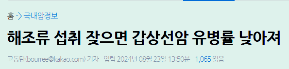 ※ 이 글은 월간암 고동탄기자님의 " 해조류 섭취 잦으면 갑상선암 유병률 낮아져" 글을 바탕으로 작성하였습니다.