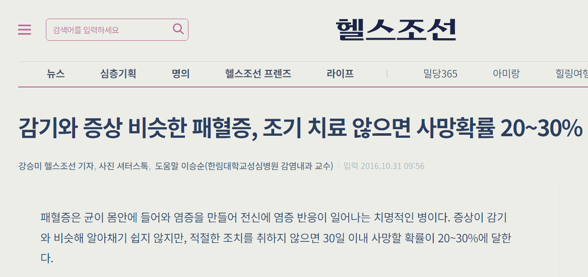 [1] 헬스조선 - 감기와 증상 비슷한 패혈증, 조기 치료 않으면 사망확률 20~ ... (https://health.chosun.com/site/data/html_dir/2016/10/31/2016103100891.html)