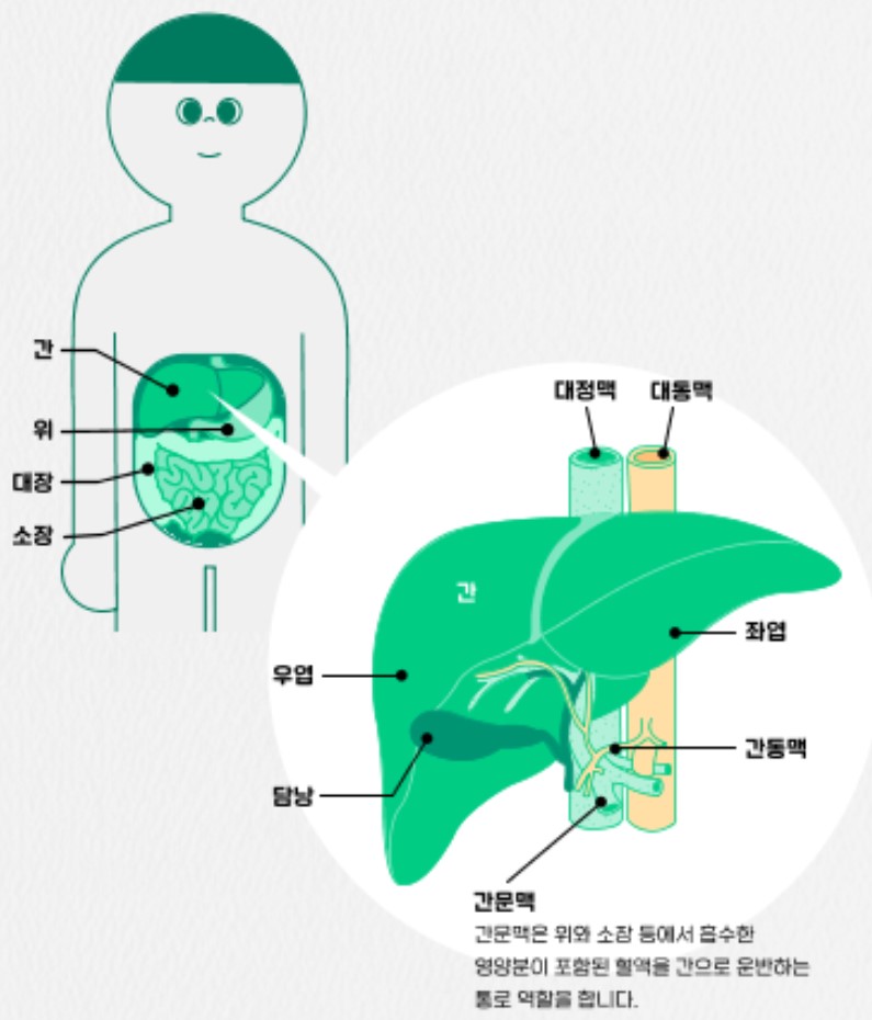 간은 영양소를 합성하여 저장하고, 비타민, 무기질, 약물 등의 대사에 관여합니다. 또한 몸 안으로 들어온 유해한 물질들을 해독하고 배설하는 역할을 합니다.