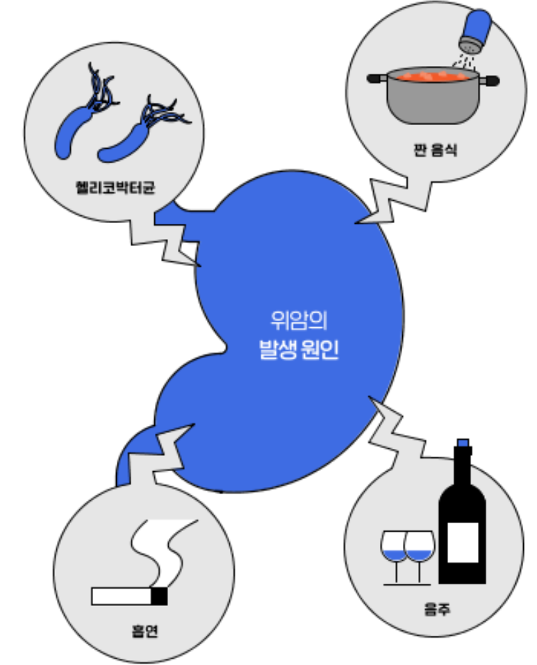 짠 음식을 많이 먹는 사람은 적게 먹는 사람보다 4.5배 정도 위암의 위험성이 높고, 흡연 및 음주 등도 위암 발생의 위험성을 높일 수 있습니다.