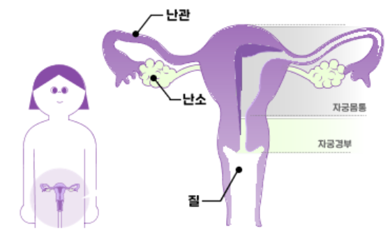 자궁은 두꺼운 근육층으로 구성된 기관으로, 위쪽의 자궁몸통과 아래쪽(입구 부분)의 자궁경부로 나누어집니다. 자궁몸통 양쪽에 난관이 위치하고 자궁경부로는 질이 연결되어 있습니다.