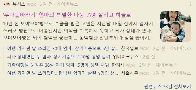 30대 여성이 갑자기 쓰러져 뇌사 상태에 빠진 후