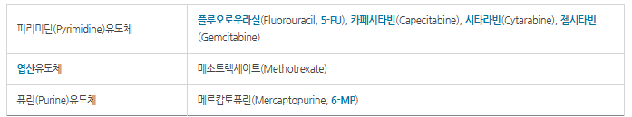 항대사물질은 정상세포의 DNA복제에 필요한 대사물질들과 유사한 구조를 가집니다. 따라서 DNA와 RNA의 구성 성분인 퓨린 (Purine)과 피리미딘(Pyrimidine)의 생합성 효소에 정상 대사물질들과 경쟁적으로 결합하여 그 작용을 방해하여 항암작용을 나타냅니다.