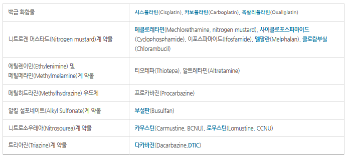 알킬화 약물은 아래와 같이 분류될 수 있습니다.