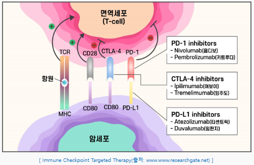 PD-1억제제(PD-1 단클론항체)에는 펨브로리주맙(pembrolizumab)과 니볼루맙(nivolumab)이 있으며, 이외에도 암세포와 면역세포 간의 결합을 차단하는 약제들이 상당수 개발되고 있으며, 이 약제들은 현재 병합요법(combination therapy)의 주요 근간(backbone) 역할을 하고 있습니다.