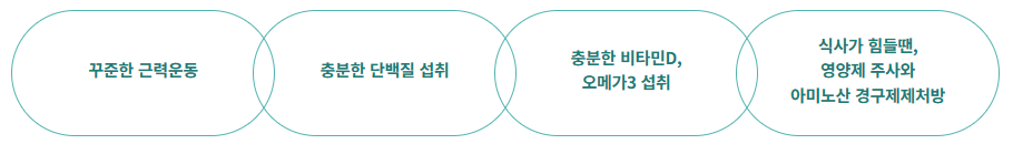 그리고, 반드시 근력 운동을 병행하셔야 하며, 의료진과의 상담을 통해 알맞은 약물도 함께 투여 받는 것이 좋습니다.