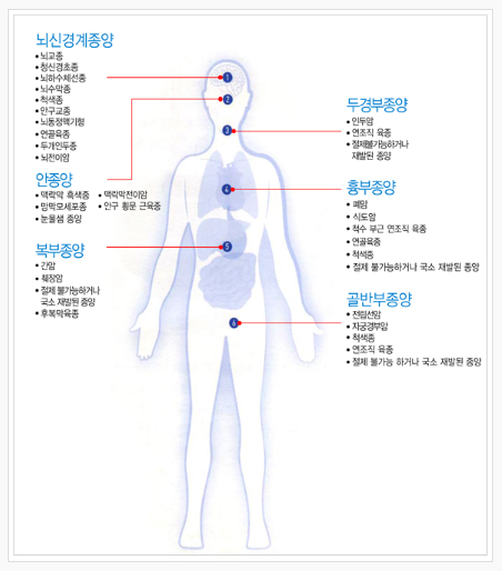 3) 뇌신경계 종양 : 뇌교종, 청신경초종, 뇌하수체선종, 뇌수막종, 두개 인두종, 척색종, 골육종, 연골육종, 뇌