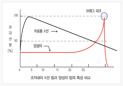 양성자는 물질 내에서 멈추기 직전까지는 방사선을 거의 방출하지 않고 대부분의 방사선량(80% 정도)을 멈출 때 방출합니다. 이 특성을 '브래그피크'라고 합니다.