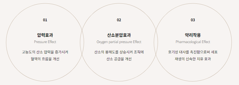일반 대기압의 2배 이상으로 가압된 챔버 내에서 100%에 가까운 산소로 호흡하게 되면 일반 대기압 상태의 혈장 내 산소 농도는 10배, 동맥혈 내 산소 분압은 15배, 산소 투과율은 3배 이상 증가하게 됩니다. 혈관이 좁아지거나 상처를 받아 혈류가 원활하지 않은 상태의 조직에 충분한 양의 산소의 공급이 가능하여 조직의 괴사를 방지하고 빠른 상처 회복에 효과가 있습니다.